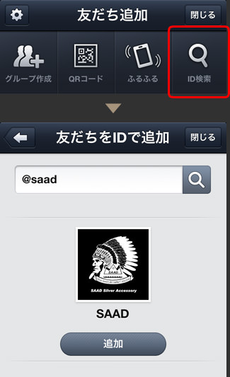 Open LINE App and go “More” → “Add Friends” → enter “@saad” in “Search by ID” → Add
